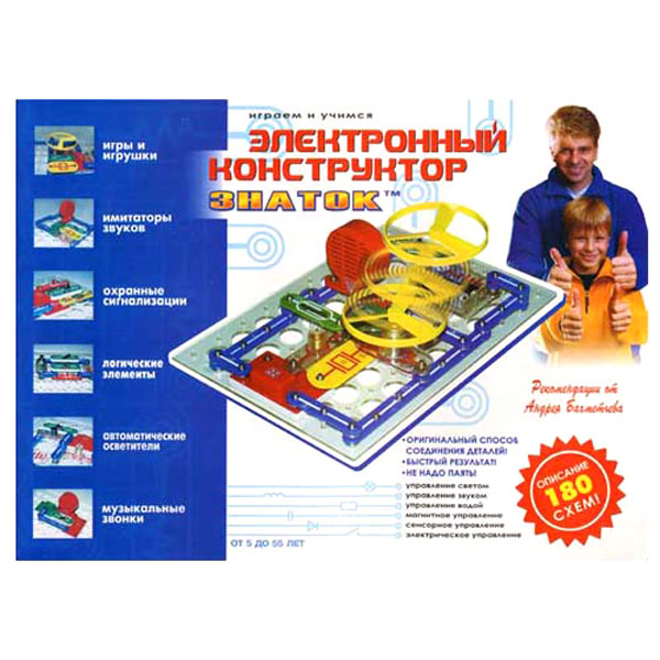 Вместе с конструктором поставляется книга, содержащая электрические и электронные схемы, которые можно собрать из этих элементов.
