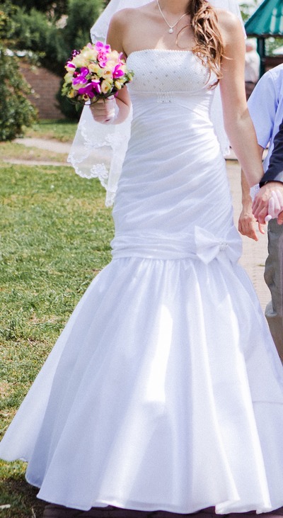Платье в идеальном состоянии, белоснежное. Корсет в жемчужинках и стразах, драпировка, фасон-рыбка. Размер 44-46, рост 180 см. К платью есть кольца, при желании фата (вышивка ручной работы). |
