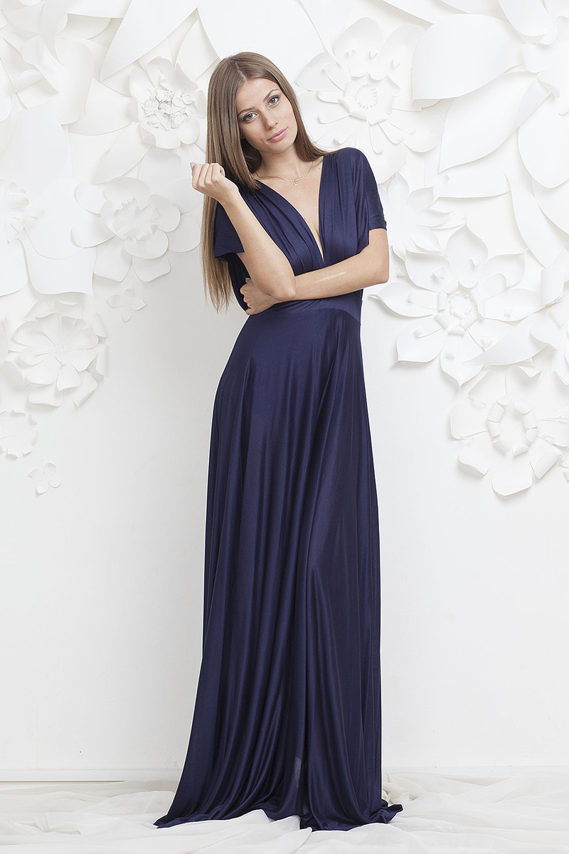 Длинное платье темно-синего цвета. Лиф платья на лямах с глубоким V-образным вырезом горловины. С помощью застежки-крючка, расположенной на задних лямах платье видоизменяется. Классический вариант: застежка-крючок расстегнут, лямы присборены, на спине вырез-каре. Если застежка-крючок застегнут, то лямы сводятся друг к другу, делая платье более оригинальным. При этом лямы можно присбаривать, либо спускать по плечу, закрывая область рук практически до локтя. Открытый срез подола. Застежка - молния в области поясницы.