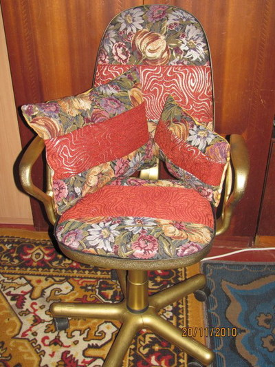 NEW! Отличный подарок! Стул компьютерный- тип ПРЕСТИЖ Цвет платистика под Золото оббивка в стиле "ПЕЧВОРК", Высота спинки 50 см. К стулу две подушечки размер 30см х20см и 40см х35см сшитые в том же стиле. Наполнитель- синтапон (мягкий) |
