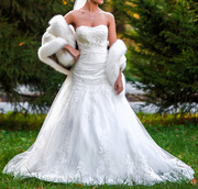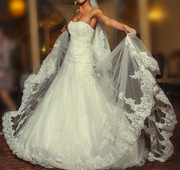 Корсет обильно украшен кружевом со всех сторон и расшит бусинками, пайетками, а также стеклярусами! По верх платья от груди начинается пелеринка украшена кружевом и стеклярусными внизу платья. Платье действительно очень красивое, приезжайте на примерку!