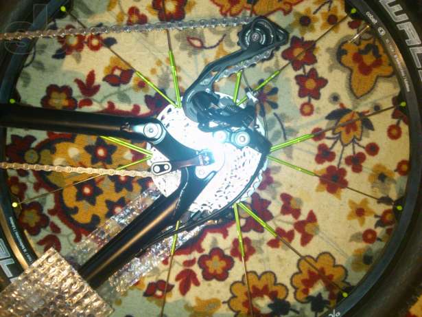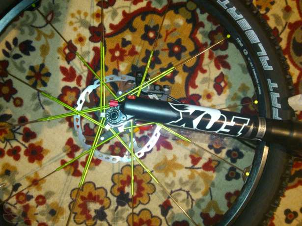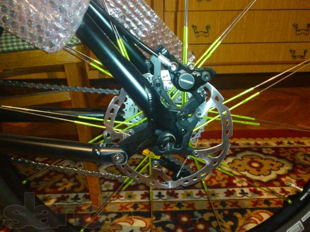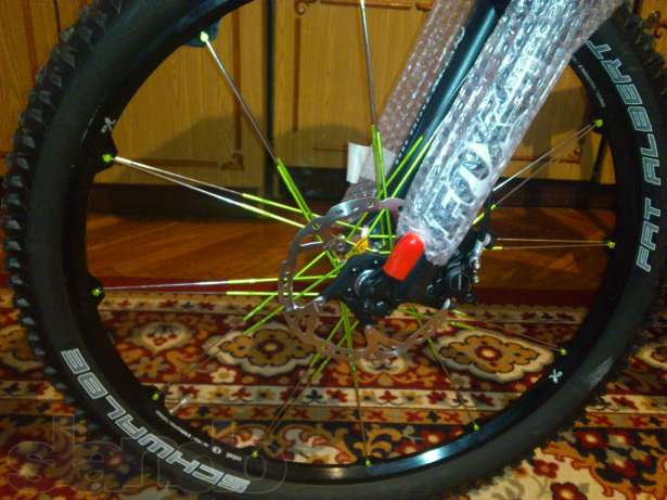 Колеса: Crank Brothers Cobalt 2, черный обод, серебристая втулка, ярко-зеленые ниппели на спицах и пальцы