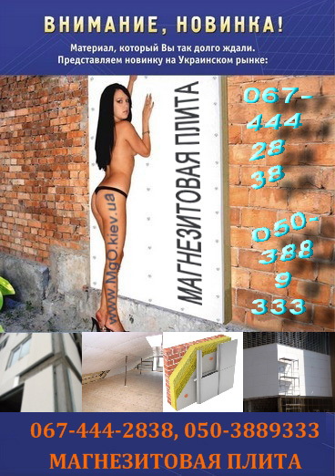 МАГНЕЗИТОВАЯ ПЛИТА. 044-3616531, 050-3889333. www.MgO.kiev.ua. Cамые низкие цены. Второе название - стекломагнезиальный лист (СМЛ). Огне- и водостойкий, экологически чистый, с отличными тепло- и звукоизоляционными свойствами, материал. Сертифицирован на Украине, прошедший испытания в ГУ МЧС. НЕ ГОРИТ, в обработке аналогичен гипсокартону, не содержит асбеста и формальдегидных смол. Альтернатива для гипсокартонных плит, OSB, QSB, ЦСП, ДСП, ДВП, ГВЛ, ГВЛВ, плоского шифера, влагостойкой фанеры и пр. Применим как для внутренней отделки так и для внешней. Размер 1220х2280 мм, толщина 3-20 мм. Поставки со склада в Киеве. |