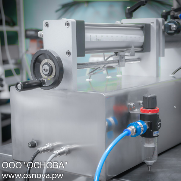 Дозатор изготавливается с мерными цилиндрами различного объема: 100, 250, 500 и 1000 мл. Доза фасовки может быть плавно отрегулирована в пределах объема мерного цилиндра. Привод установки - пневматический.