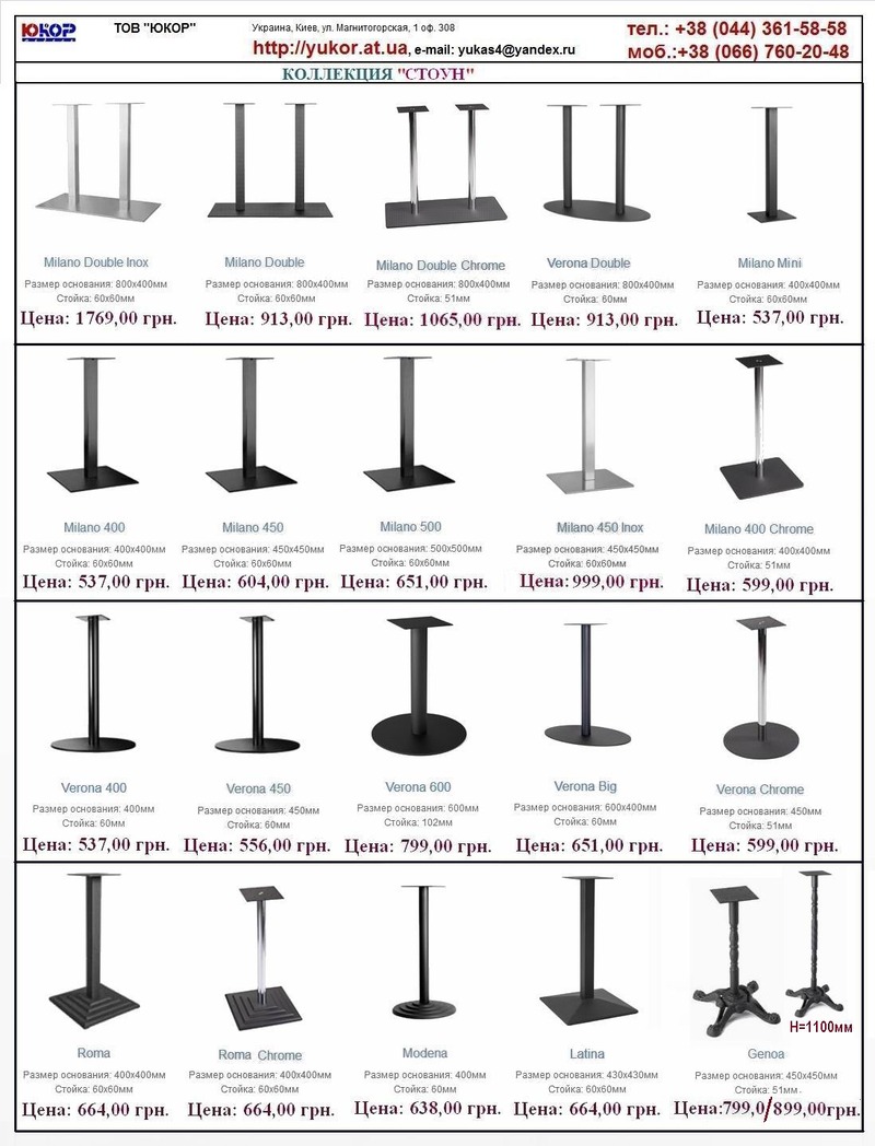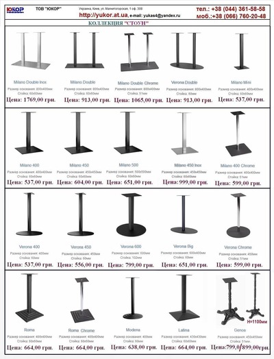 Барные столы, основания (базы, ножки, опоры, подстолья) для барных столов: РОМА (Roma), РОМА (Р) (Roma (R)), РОМА Хром (Roma Chrome), МОДЕНА (Modena), МОДЕНА Хром (Modena Chrome), МИЛАНО 400, МИЛАНО 450, МИЛАНО 500 (Milano), Милано Софт (Milano Soft), МИЛАНО (Р) 400, МИЛАНО (Р) 450, МИЛАНО (Р) 500 (Milano (R), Верона 400, Верона 450, Верона 500 (Verona), МИЛАНО 400 Инокс, МИЛАНО 450 Инокс, Милано 500 Инокс, МИЛАНО (Р) 400 Инокс, МИЛАНО (Р) 450 Инокс, МИЛАНО (Р) 500 Инокс (Milano Inox), ВЕРОНА Топ Инокс (Verona Top Inox), МИЛАНО Биг (Milano Big), МИЛАНО Дабл (MIlano Double), ВЕРОНА Биг (Verona Big), ВЕРОНА Дабл (Verona Double), МИЛАНО Биг Инокс (Milano Big Inox), Милано Дабл Инокс (Milano Double Inox), МИЛАНО Топ 400, МИЛАНО Топ 450, МИЛАНО Топ 500 (Milano Top), МИЛАНО Топ (Р) 400, МИЛАНО Топ (Р) 450, МИЛАНО Топ (Р) 500 (Milano Top Р), МИЛАНО Топ Биг, МИЛАНО Дабл Топ, Верона Топ 530 (Verona Top), Милано Мини (Milano Mini), МИЛАНО Хром (Milano Chrome), Милано Дабл Хром (MIlano Double Chrome), Верона Мини (Verona Mini), Верона Хром (Verona Chrome), Наполи 360, Наполи 460, Наполи 560, Наполи 660 (Napoli), ПАЛЕРМО 660, ПАЛЕРМО 800 (Palermo), БАРИ 500, БАРИ 660, БАРИ 800 (Bari), ВЕНЕЦИЯ 1000x560, ВЕНЕЦИЯ 1000x660, ВЕНЕЦИЯ 1200x560, ВЕНЕЦИЯ 1200x660, ПАРМА 630, ПАРМА 780 (Parma), ГЕНУЯ (Genoa), ЛАТИНА (Latina), ГАРДА (Gerd)