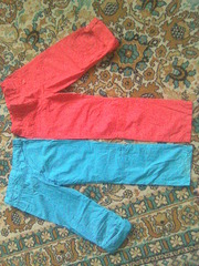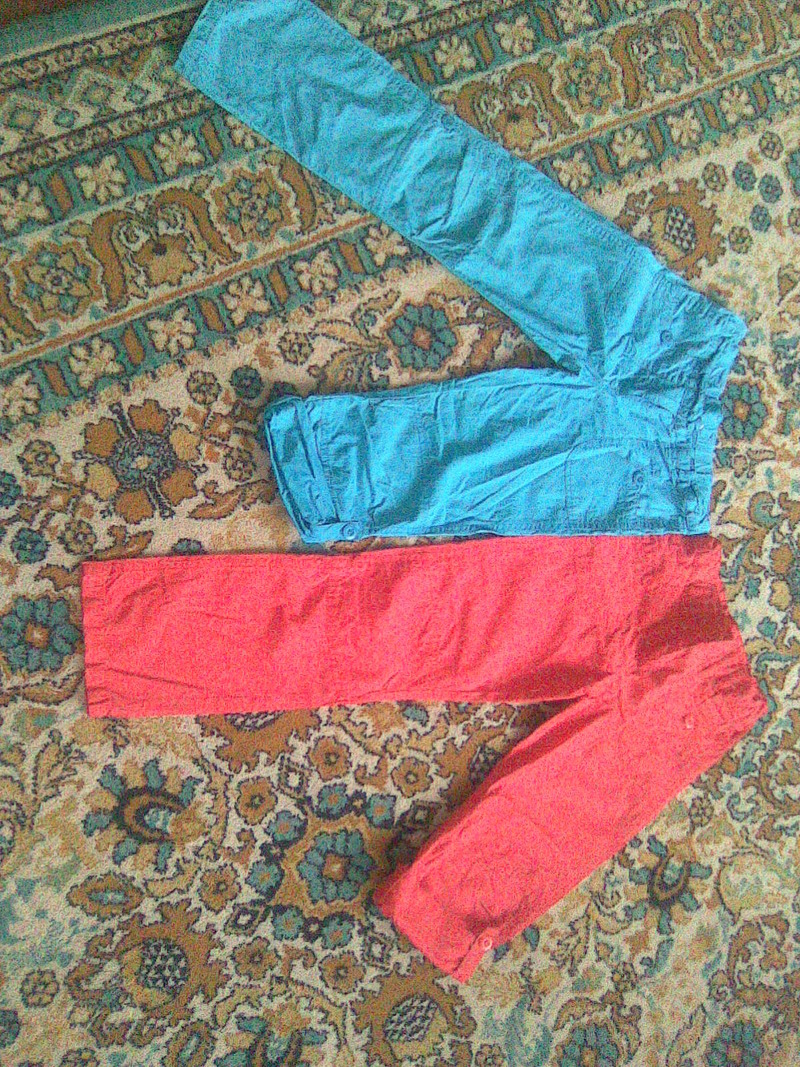 штаны можно подстегать на пуговицу, получатся капри. состояние хорошее. в двух цветах: красный и голубой.100% cotton |