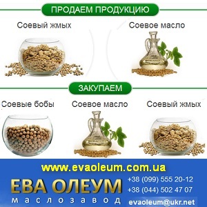 Продаем: Соевый жмых протеин выше 40%; Соевое масло высшего сорта без фузы; Полножирный экструдированный соевый жмых. Покупаем сырье: Сою; Сою с высокой влажностью, маленьким протеином, половинки. Услуги по переработке (давальческое сырье): Переработаем Вашу сою. Экструдируем Вашу сою в жмых. Предоставляем услуги по сушке зерновых и бобовых культур: сои, кукурузы, подсолнуха, семечек. Доставка по Украине. ООО «ЕВА-Олеум» +380(99)5552012 +380(68)5133888 www.evaoleum.com.ua |