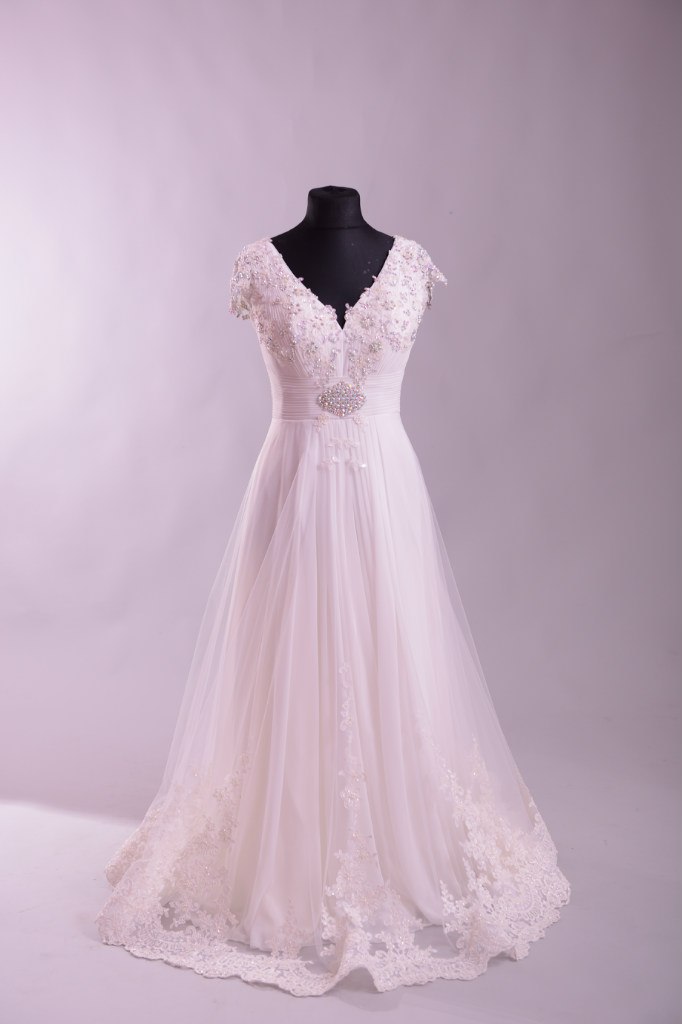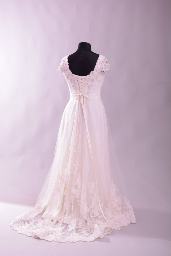 Модель: "А"-образный силуэт платья подчеркнет стройность фигуры. Укороченый корсет с плавной ригулировкой на спине позволит модельировать наряд от 48 до 52 размера, а также благодаря своей форме обеспечивает максимально удобное ношение платья на протяжении всего торжественного дня. Юбка выполнена в 4 мягких слоях - фафта, креп, шифон и парижский фатин. Довершает образ небольшой, изысканный шлейф.