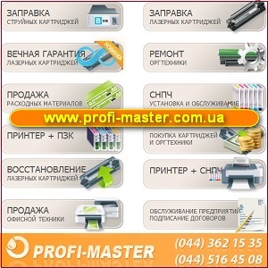 Ремонт 2014 оргтехники в Киеве. Заправка лазерных картриджей. Компания «Profi-Master» предлагает: Восстановление лазерных картриджей. Заправка струйных картриджей. Заправка лазерных картриджей. Продажа расходных материалов для оргтехники. Продажа офисной техники. Ремонт офисной и домашней оргтехники. Цены ниже рыночных. +38(044)3621535 +38(044)3831539 www.profi-master.com.ua 2332804@mail.ru |