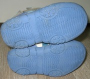 Ортопедические ботинки голубого цвета. Застегиваются на липучку, сзади дополнительная липучка выше пятки, чтобы хорошо фиксировать ножку и для удобства при одевании. Верх и подкладка – кожаные. Стелька ортопедическая. На носике есть небольшая царапина. |