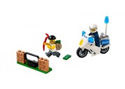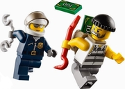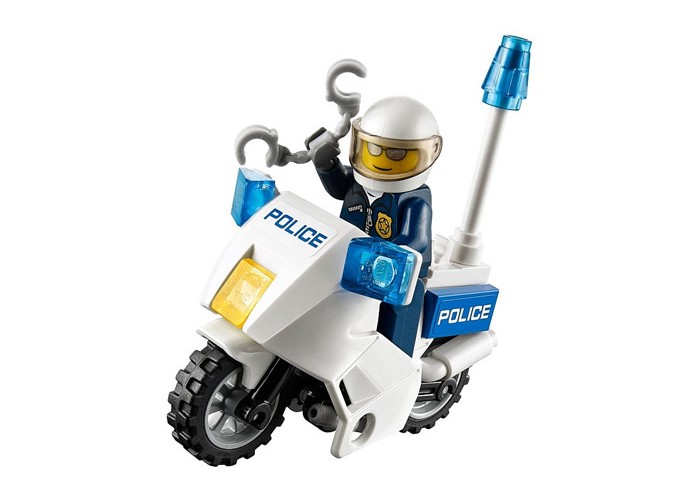 Разбита витрина небольшого минимаркета на заправке. Ломом был взломан кассовый аппарат. Здесь явно побывал грабитель. На вызов выехал патрульный полицейский на своём байке. Грабитель с сумкой с деньгами пытается скрыться во дворах перепрыгнув через ограду. Но до неё ещё нужно добежать. Задача полицейского настигнуть вора на своём белом полицейском мотоцикле, надеть на него наручники и доставить в участок. Но будьте осторожны, грабитель всё еще не выкинул свой лом! В наборе Погоня за грабителем 60041 присутствуют две минифигурки: полицейского в шлеме и грабителя.