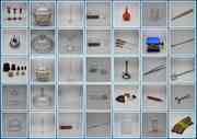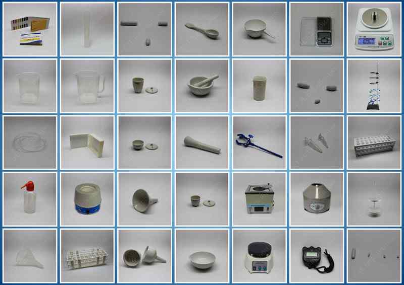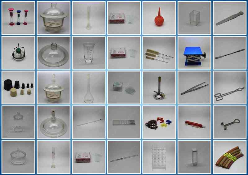Стаканы, колбы, пробки, воронки, чаши испарительные, чаши кристаллизационные, пробирки, чаши Петри, сосуды колоколообразные, эксикаторы, флаконы капельные, бутылки для реагентов, стаканчики для взвешивания, бутыли Вульфа, бутылки с винтовой крышкой, керны, муфты стекла предметные, стекло покровное, камера Горяева, сушка для посуды, столик подъемный, горелка Бунзена, кюветы, щипцы тигельные, мензурки с ручкой полипропиленовые, тигли фарфоровые, кастрюля с ручкой фарфоровая, чаши испарительные фарфоровые, воронки Бюхнера, ступка с пестиком фарфоровая, бани водяные, испарители ротационные, центрифуги, весы лабораторные, магнитные мешалки, колбонагреватели, ph – тестеры, таймер электронный, термометр электронный, и многое другое.