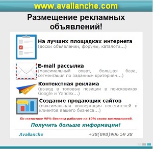 Реклама для привлечения клиентов и развития бизнеса. Комплекс услуг для развития бизнеса. Интернет и e-mail маркетинг для привлечения клиентов. Создание продающих сайтов. Продвижение в Топ поиска Google и Yandex. Индивидуальный подход к каждому клиенту! 100% Гарантия роста! Павел +38(098)9065928 http://avallanche.com/ |
