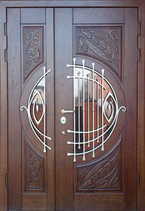 Дверь может украшать ручная резьба, стеклопакеты с пленкой противоударной, защищенные кованой решеткой, нержавеющие пороги и отбойники, накладные элементы различного дизайна, обклад.