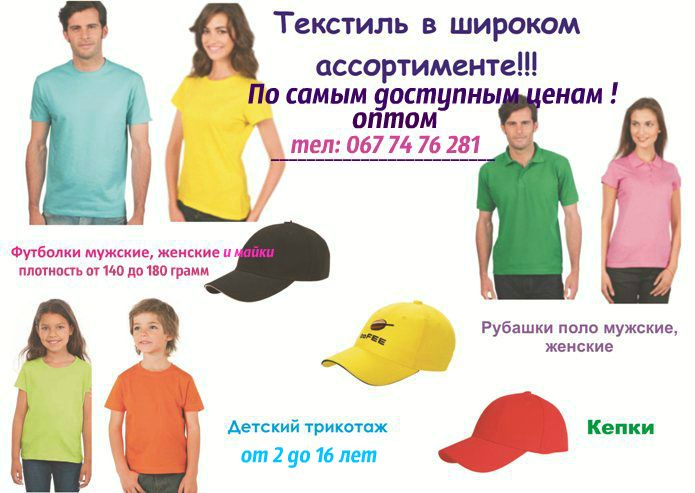 Оптовая продажа футболок, кепок, майки мужские, женская футболка! Большой выбор цветовой гаммы, так же как и большой выбор плотностей футболок! Начиная от 130-180г! Стоимость футболок зависит от их плотности и качества. Всегда в наличии большое количество футболок. Минимальные цены, которые Вас заинтересуют. Подробности можно узнать по тел. Доставка по Украине. |
