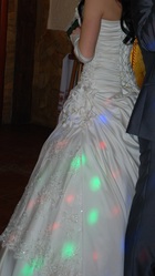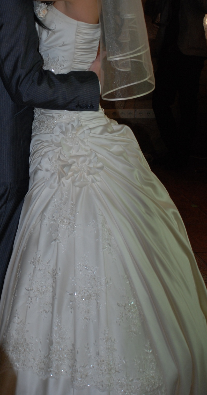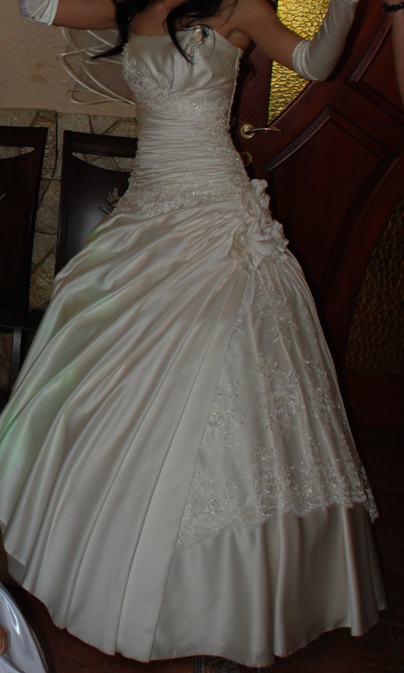Свадебное платье.Цвет нежно бежевый(шампань).На спине переплет,красивый цветок на талии,не много украшений.Чистое,после химчистки. |