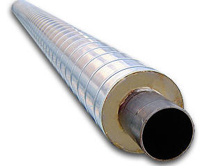 Стальная труба и слой пенополиуретана защищены оболочкой из полиэтилена или спирально-навивной оболочкой из оцинкованной стали (СПИРО).