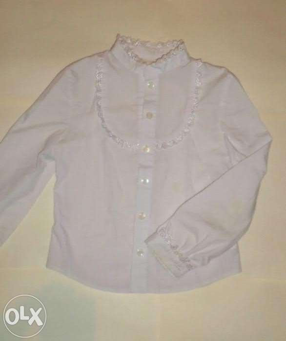 Блузка белая на девочку. Застежка спереди на пуговицах. Длина изделия по спинке- 43 см, длина плеча- 9,5 см, длина рукава- 43 см. Отличное состояние! 067-856-53-97Лена |