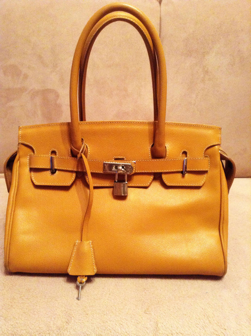 Итальянская сумка выполнена из натуральной кожи, отделка напоминает стиль сумочек Hermes (но это не копия). Красивый декор в виде замочка и ключика. Вместительная, имеет хорошую подкладку из шелковой материи, много отделений. Строчки, молнии, прочая фурнитура - очень качественные. Сумка была куплена в магазине 'Grandi Firme" в Киеве. Была в использовании не долго, состояние хорошее! Длинна, высота сумки - примерно лист А4. |