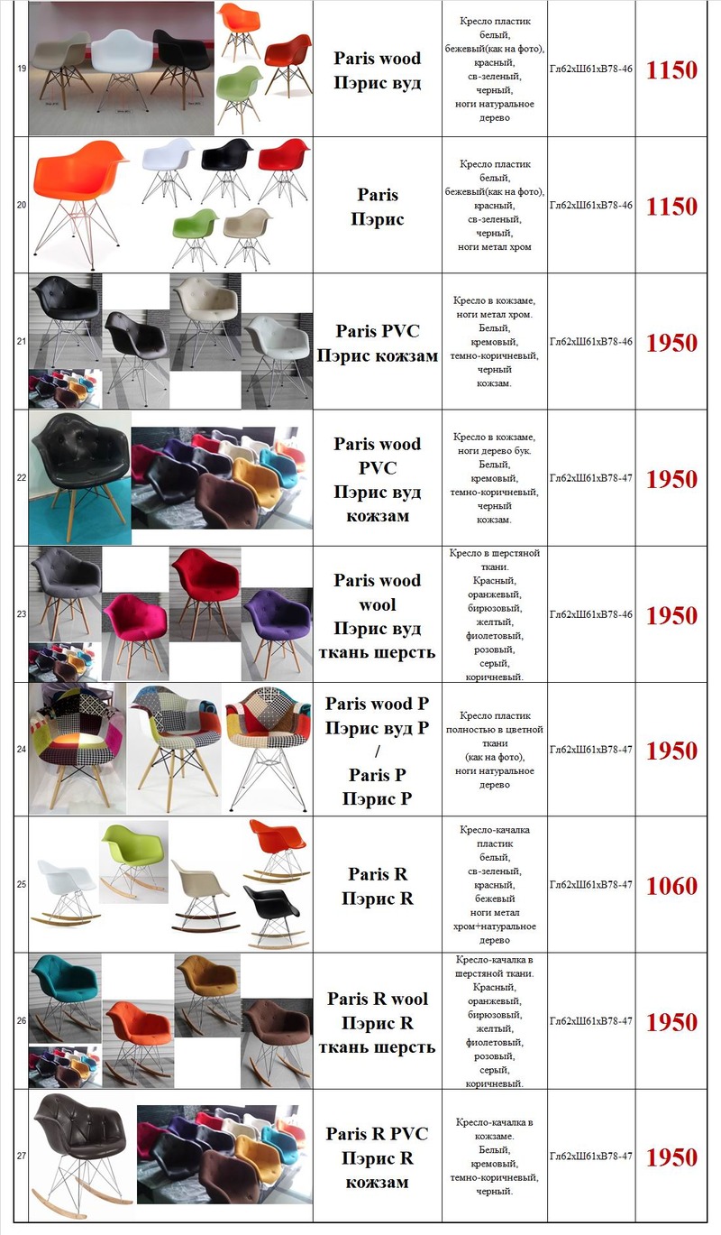 Дизайнерская мебель, дизайнерские стулья, дизайнерские кресла, дизайнерские пуфы, дизайнерские столы, дизайнерские диваны, дизайнерские шезлонги, дизайнерские оттоманкии для кафе, баров, ресторанов, ночных клубов, пабов, бистро, чайных, спорт-баров, боулинг-клубов, фастфудов, гостиниц, кофейень, пиццерий, развлекательных комплексов, уличных площадок, центров развлечений, развлекательных центров, дома, кухни, офиса: стул Пэрис (Paris), стул Пэрис вуд (Paris wood), стул Пэрис PC (Paris PC), стул Пэрис вуд PC (Paris wood PC), стул Пэрис CPC (Paris CPC), стул Смарт (Smart), стул Классик (Classic), стул Эймс (Eames), стул Paris wood PVC (Пэрис вуд кожзам), стул Crown wood PVC (Краун вуд кожзам), кресло Eames (Эймс), кресло Пэрис CPC (Paris CPC), кресло Лаундж (Lounge), кресло Шарм (Charme), кресло Классик (Classic), кресло Гарден (Garden), кресло Пэрис вуд PC (Paris wood PC), кресла Пэрис Р PC (Paris R PC), кресло Пэрис вуд (Paris wood), кресло Пэрис (Paris), кресло Пэрис вуд T (Paris wood T), кресла Пэрис Р (Paris R), кресло Paris PVC (Пэрис кожзам), кресло Paris wood PVC (Пэрис вуд кожзам), кресло Paris wood wool (Пэрис вуд ткань шерсть), кресло-качалка Paris R wool (Пэрис R ткань шерсть), кресло-качалка Paris R PVC (Пэрис R кожзам). Пластиковые стулья: стул Пантон, стул Дорис, стул Льюис, стул Фантазия, стул Ронда, стул Ронда РС, стул Орли, стул Орли РС, стул Спектрум, стул Спектрум С. Дизайнерские стулья и кресла: стул Тауэр, стул Тауэр вуд, кресло Тауэр, кресло Тауэр вуд, стул Майя, стул Лейсур, стул Давис, стул Дэвис, стул Тюльпан. Стул Эймс (стул Eames), кресло Эймс (кресло Eames). Стул Panton, Стул Louis ghost, Стул Victoria ghost, Стул La marie, Стул Chair one, Стул Chair one bar, Стул Miura bar, Кресло Eames (ножки деревянные), Стул Eames (ножки металл), Стул Eames (ножки деревянные), Стул Eames эко-кожа (ножки деревянные), Стул Mademoiselle, Диван Pop 3-ка, Кресло Swan, Кресло Swan, Кресло Swan, Кресло Egg, Кресло Egg, Кресло Egg, Кресло Egg, Egg с отоманкой, Шезлонг Lounge, Шезлонг Rocking, Кресло Platner, Стул Bertoia, Стол Panier, Стул Prince aha, Стул Eames детский (ножки деревянные), Стул Puppy средний, Часы Nelson, Вешалка Eames.
