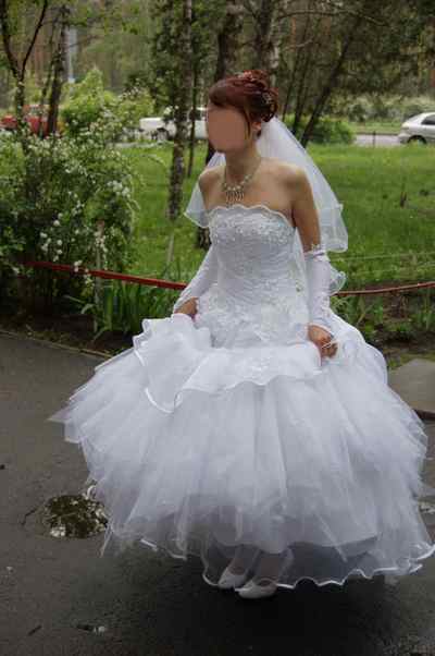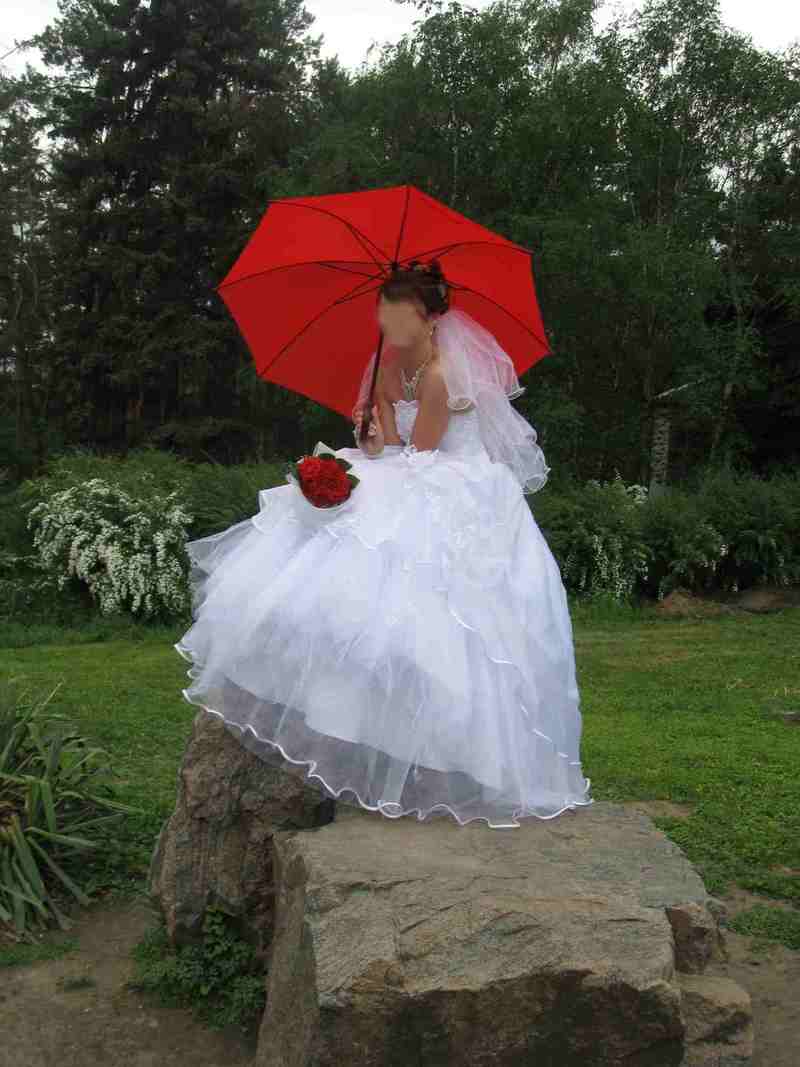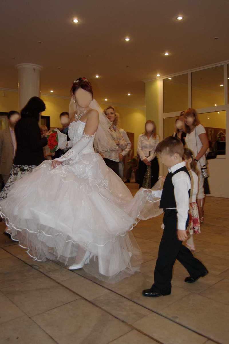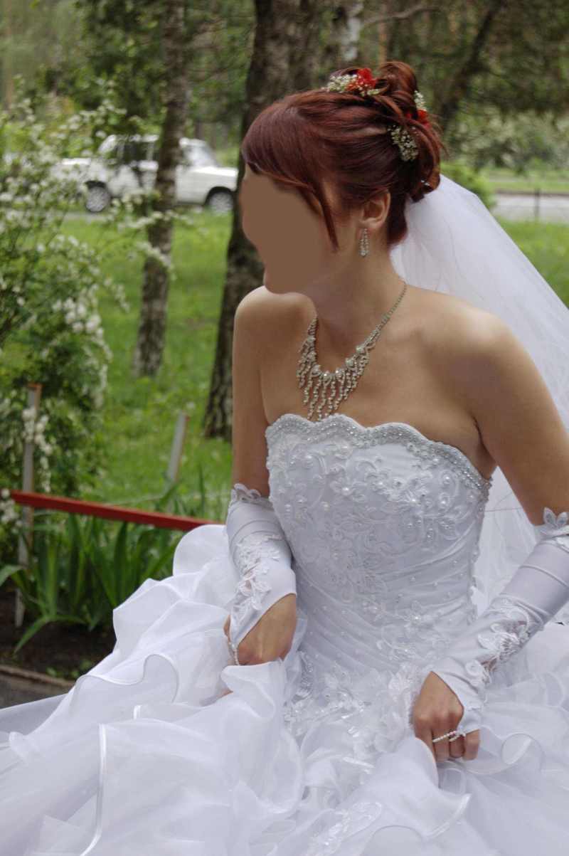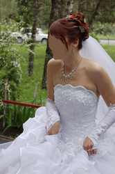 Как от сердца отрываю... Очень удобное платье. Чувствовала в нем себя королевой, при этом могла кататся на лошадях, бегать, прыгать, играть в футбол, лазять по деревьям. Вобщем платье для подвижной озорной девченки или для той которая не хочет в этот день запутатся и упасть. Платье после хим. чистки + перчатки + балеро |