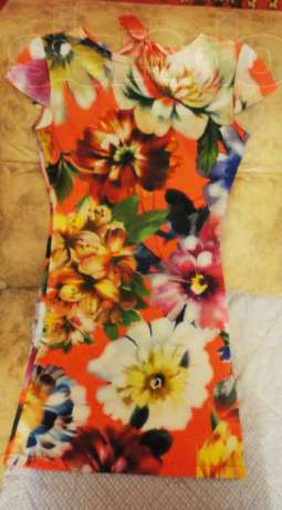 Продам яркое платье в цветок,на спине небольшой вырез,подчеркивает бантик с ленточек,платье немного выше колен. |