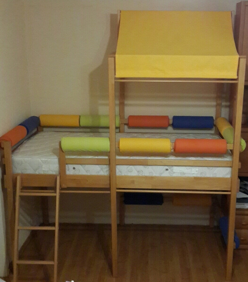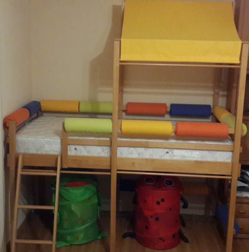 Кровать со съемной крышей и съемными мягкими валиками по периметру кровати и игрового места. Крыша и чехлы валиков из натуральной ткани, можно стирать в машинке.