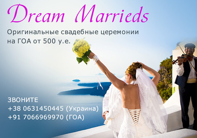 Туристическое агентство «Dream Marrieds» проводит оригинальные свадебные церемонии на ГОА от 500 у.е. Уникальные свадьбы на любой вкус и бюджет. Вы можете заказать любой из понравившихся вам сценариев: - однополые браки; - свадьбы на пляжах по любому сценарию на любой вкус с любой програмой свадьбы для 2-х на необитаемом пляже; - свадьбы на слонах; - Цыганские свадьбы; - Хиппи свадьбы; И многие другие интересные варианты. Также у нас вы можете получить сертификат о заключении брака на небесах и заказать миллион алых роз, а также подарить звезду с неба. По всем вопросам звоните: +380631450445 (Украина) +917066969970 (ГОА) Или пишите на почту: mariamirabella666@list.ru |