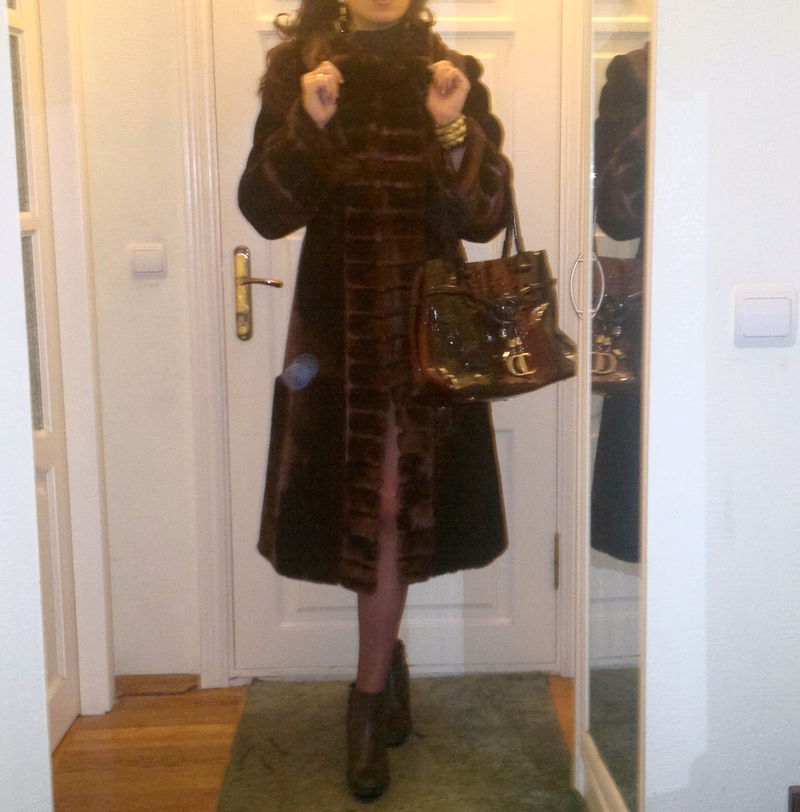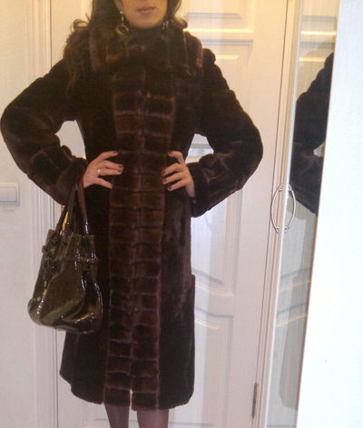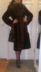 Шуба из шоколадного ливанского мутона с вставками из натуральной телячьей кожи винного цвета. шуба ОЧЕНЬ красивая, сделана киевским дизайнером, точная копия модели от Sonia Rykiel. Цена 9500 грн., торг. |