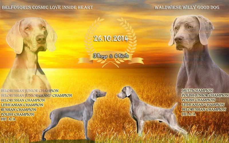 Питомник FCI "Romanzo Rosa" предлагает щенков веймаранера от родителей-чемпионов. Выездная вязка (Польша). Отец: BIS MultiCh Waldwiese Willy Good Dog (Импортирован из Австралии) - Юный Чемпион Польши, Юный Чемпион Беларуси, Чемпион Польши, Чемпион Литвы, Чемпион Беларуси, рабочий диплом. Мать: Belfegorus Cosmic Love Inside Heart - Юный Чемпион Беларуси, Юный Гранд Чемпион Беларуси, Чемпион Беларуси, Чемпион России, Чемпион Литвы, Чемпион Польши. Свободны 4 девочки и 1 мальчик |