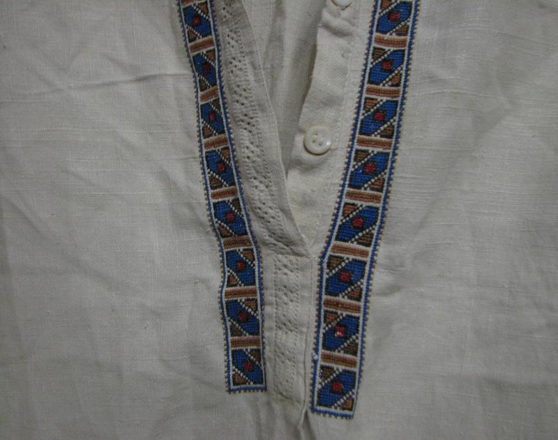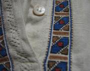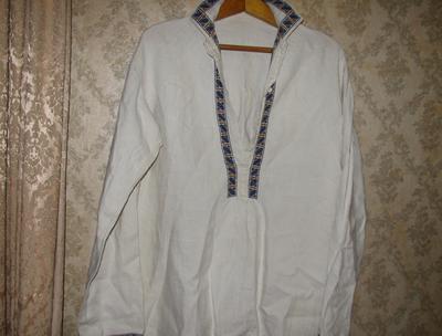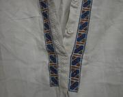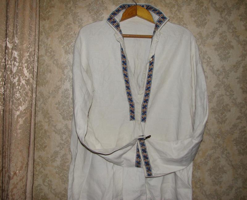 Продается старинная украинская рубашка вышиванка. Размер 54-56. Выполнена из домотканого полотна - льна Вышивка ручная по рубашке. Рубашка с застежкой на пуговицах, прикрытых манишкой с узором, воротник стойка. Пошита не позже 1920 годов прошлого века. В отличном состоянии, практически не носилась. Досталась в наследство от бабушки. Пролежала в сундуке сельского дома Черниговской области более 80 лет. (две рубашки меньшего размера оставил себе)Рубашка визуально имеет уширение сверху - вниз, что характерно для пошива вышиванок того времени. Размеры рубашки: ширина плеч - 52см, ширина груди -62 - 63см, ширина внизу - 69см, длина рубашки - 73см, длина рукава - 64см, ширина рукава - 20см |