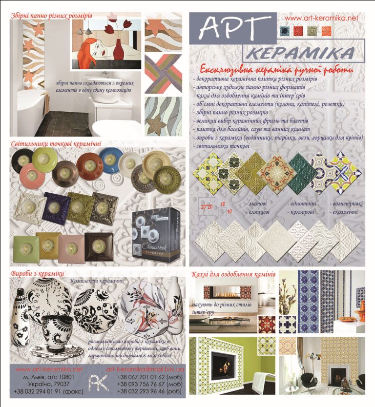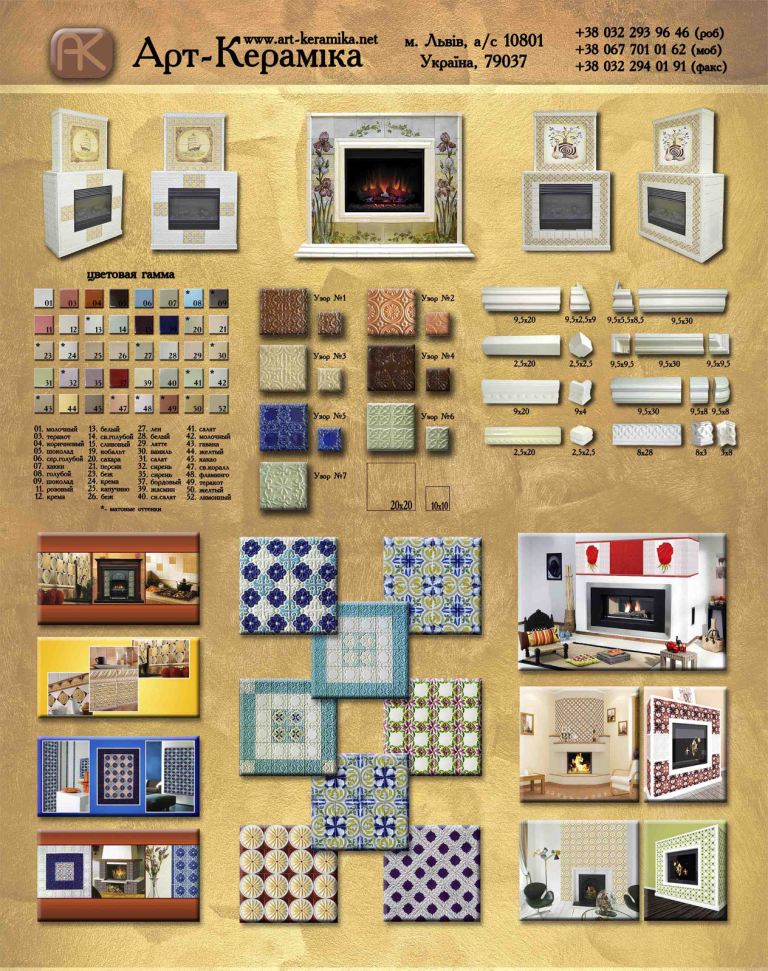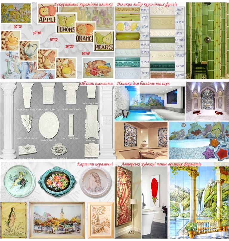 Эксклюзивная керамика ручной работы - Декоративная керамическая плитка разных размеров - авторское художественное панно различных форматов - изразцы, камины - объемные декоративные элементы (колонны, капители, пилястры, розетки) - фризы - плитка для бассейнов и саун - декоративная плитка для ванных комнат - изделия из керамики (часы, тарелки, вазы, горшки) – светильники точечные керамические |