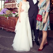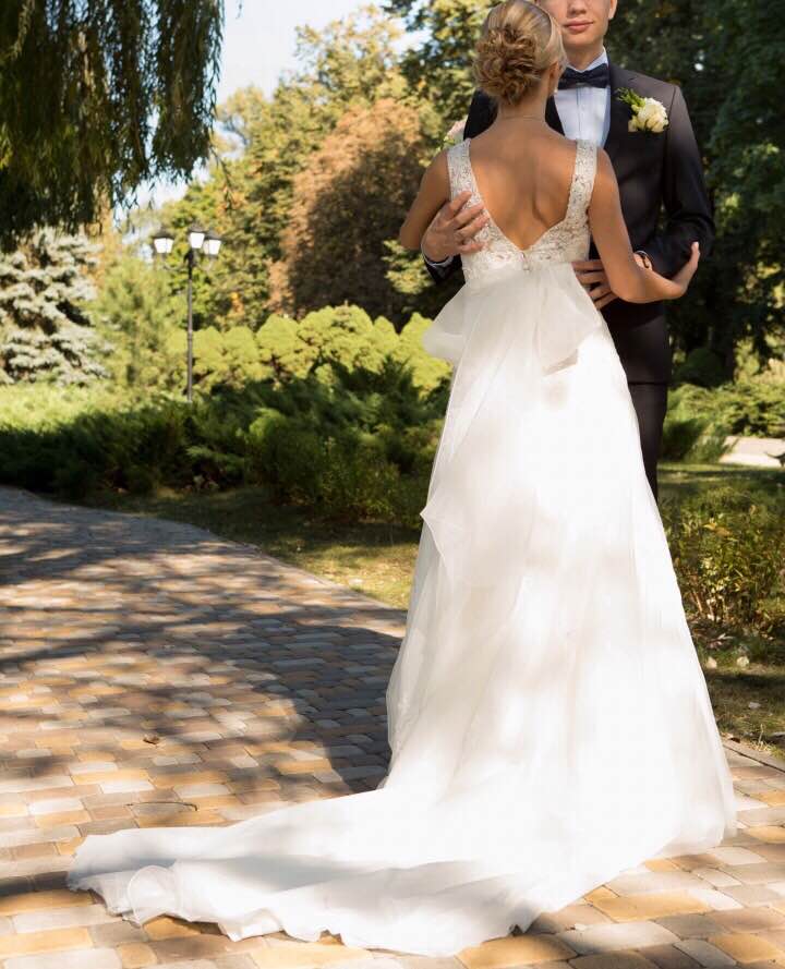 Платье американской фирмы "Mori lee by Madeline Gardner". Платье выполнено в классическом стиле из французского кружева. Открытая спинка рассшита камнями. Платья имеет шикарный длинный шлейф полностью расшитый гладью и декорированными камушками и бисером, который подкапывается сзади, для свободного перемещения невесты. Вес платья комфортный для ношения его целый вечер, так выполнено оно из шелковой тафты, шелка, муслина, шифона, без корсетного тяжелого подъюбника. Изюминка платья - шелковый бант - пояс. Платье после тщательной химчистки, на платье ни единого намека на носку (ни пятен, ни дырок). Ушивалось под личные параметры невесты.размера XS - талия 62 см, обхват груди - 81 см, обхват бедер 84 см, длина платья 160 см (без шлейфа), на платье оставлен небольшой припуск - что бы слегка расшить в размере). Платье покупалось в сентябре 2014 года.