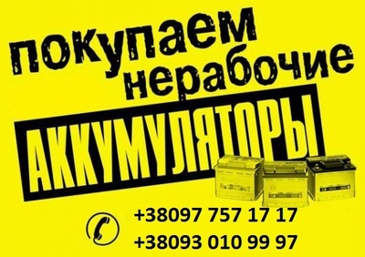 Закупаем на постоянной основе отработанные аккумуляторные батареи от автомобилей, тяговые аккумуляторы от электро - погрузчиков, аккумуляторы от источников бесперебойного питания, Гелиевые аккумуляторы, щелочные аккумуляторы, аккумуляторы б/у от любого транспортного средства в том числе авиационные и корабельные аккумуляторы. Работаем по Киеву и области, самовывоз. Также есть возможность вывоза с других областей Украины ( зависит от объема.) Цены лучшие в городе работаем оперативно, расчет на месте. Для крупных компаний с большим объемом возможен безналичный расчет. |