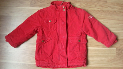 Демисезонная курточка « Topolino » (Германия) на 80/86 см. Трикотажные резиночкой манжетики и горлышко. Есть подкладка из баечки и тонкий слой утеплителя. Всё 100 % хлопок, утеплитель – полиестр . Цвет слега застиран, не хватает зубчиков на молнии в районе горлышка, там мы застёгивали на кнопочки. Длина рукавчика с резинкой -33 см.,длина по спинке-43 см.,расстояние под мышками -35 см. |