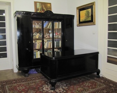 кабинет антикварный шкаф + стол из дуба крашеного в черный цвет Изготовленный в 30-ые годы Привезен в 1945 г. из Германии Не реставрированный, но в очень хорошем состоянии Родная фурнитура (кроме ключей) Габаритные размеры шкаф 2110 х 470 мм (с карнизом 2117 х 490 мм) высота 2020 (2110) мм стол (двухтумбовый)столешница 1570 х 790 мм вместе с ножками 1630 х 790 мм Высота 780 мм. Ноги резные из цельного куска массива Шкаф для перевозки разбирался |