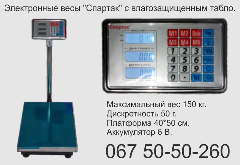 Продам весы электронные на 150 кг., шаг 50 г. Весы стальные со штативом, платформа с нержавейки размером 40/50 см. Штатив снимается, весы могут работать и без него. Питаются весы от сети 220 В. и встроенного аккумулятора, который держит от 1-го дня до нескольких недель. Табло весов жидкокристаллическое с зелёной подсветкой, цифры чётко видно на солнце. Встроенный калькулятор считает цену товара, суммирует несколько взвешиваний в одну общую стоимость. Цены можно сохранять в память весов. Тара снимает вес упаковок и дает возможность увеличить рабочую поверхность весов. Весы автоматически выставляются на ноль при каждом включении, имеют самодиагностику неполадок. Весы компактные, легко собираются и разбираются при необходимости. Вес около 8-ми кг.