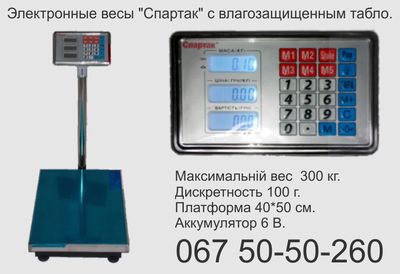 Предлагаю электронные весы до 300 кг «Спартак» VZ-300. Весы имеют влагозащищенное табло. Максимальный вес300 кг., дискретность отсчёта 100 г., размер рабочей поверхности платформы 40/50 см.