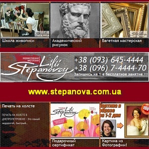 Художественная Студия для детей и взрослых. Хотите прикоснуться к прекрасному? Художественная мастерская Лилии Степановой приглашает на мастер-классы по живописи и академическому рисунку. Ваш уровень подготовки значения не имеет. Первое занятие - бесплатно! Уроки маслянистой живописи. Академический рисунок. Багетная мастерская. Живопись на заказ. Печать на холсте. Картина из фото. +38(093)6454444 +38(096)7444470 Днепропетровск, Баумана, 10 www.stepanova.com.ua |