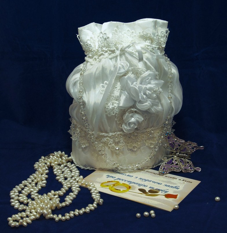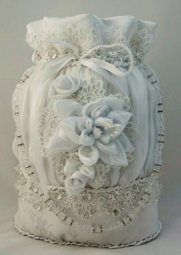 Эксклюзивная, ослепительно белая свадебная сумочка ручной работы, выполнена из жаккарда, с использованием натурального горного хрусталя (символа чистоты) и серебристого чешского бисера. Цветочная композиция выполнена из нежного кружева и органзы. Ручка сумочки изготовлена из натурального горного хрусталя и вставок со стразами Сваровски. Подкладка из натурального шелка имеет два кармашка. Высота 22см, ширина -16см, ширина по боку – 9 см. Натуральные камни для самых драгоценных невест! |