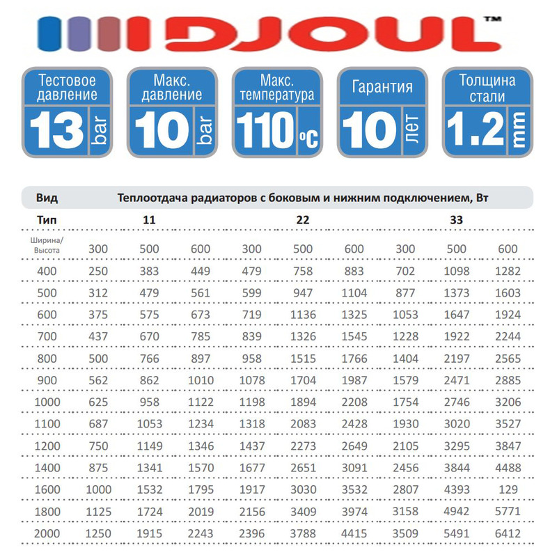 Технические характеристики радиаторов DJOUL: