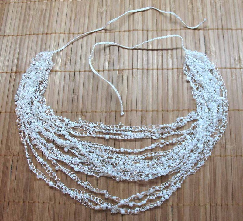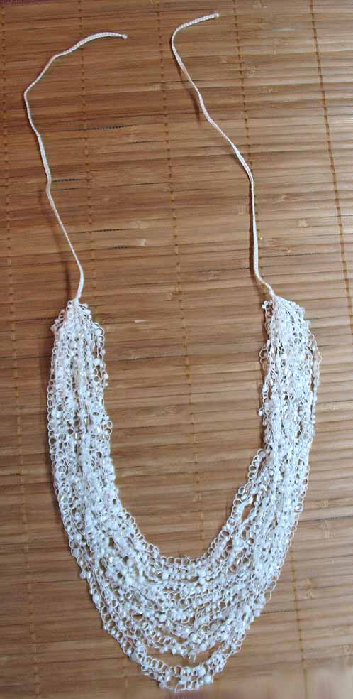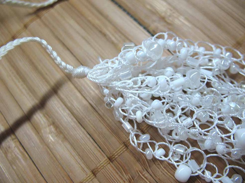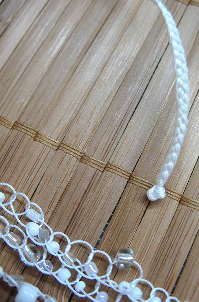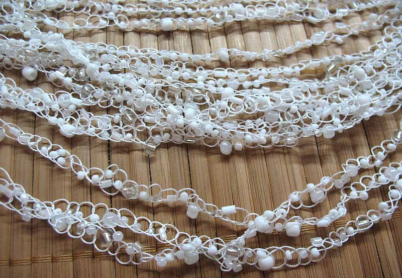 Цвет нити – белый. Бисер пластиковый белый, с металлическим блеском и белый прозрачный.