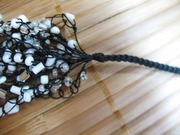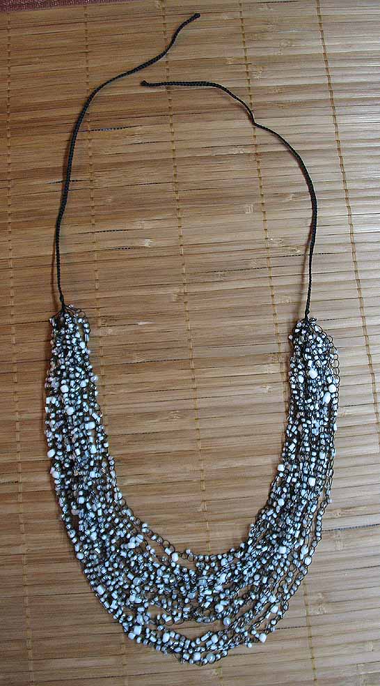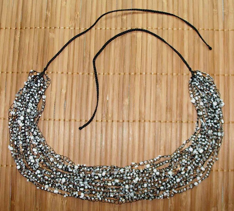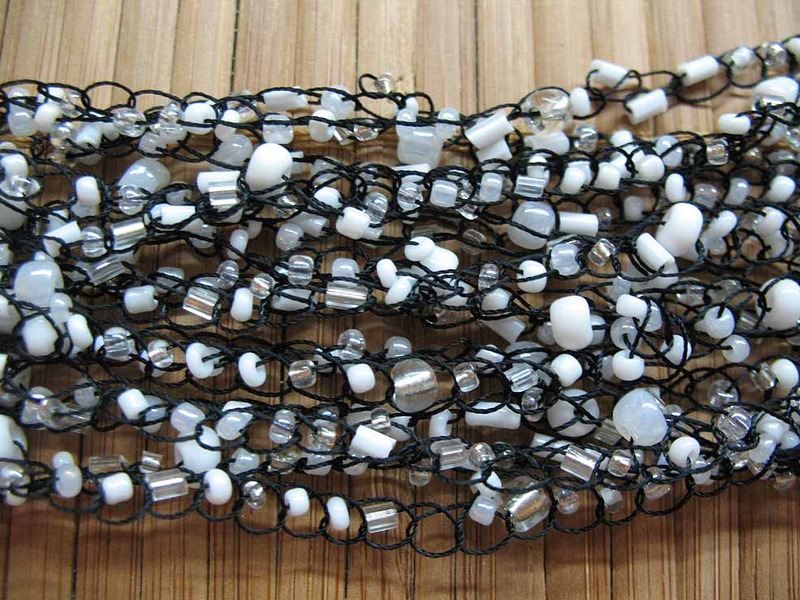 Цвет нити – черный. Бисер пластиковый белый, с металлическим блеском и белый прозрачный.