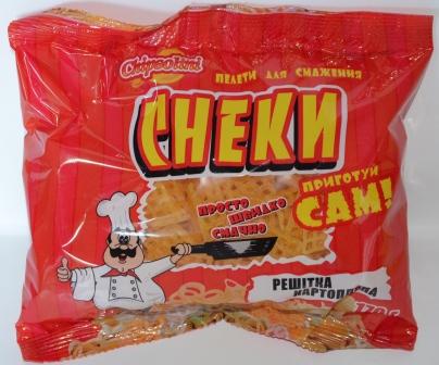 ЗАКУСКА-СНЕКИ –это полуфабрикат для обжарки из картофельной муки: "СНЕКИ. Приготуй сам!" Картопляні кільця зі смаком цибулі, "СНЕКИ. Приготуй сам!" Решітка картопляна. Для быстрого приготовления готовой ЗАКУСКИ-СНЕКОВ необходимо обжарить полуфабрикат в разогретом масле на протяжении 3-5 секунд и добавить соль, приправы по вкусу. Поджарив ЗАКУСКУ-СНЕКИ "Приготуй сам!", у вас будет простая, легкая, быстрая и свежая закуска к пиву, гарнир к бульону или хрустящая вкусность для детей. Со 100 грамм полуфабриката получится 350-400 грамм готовой продукции. Детальная инструкция для приготовления напечатана на обороте упаковки. ЗАКУСКА-СНЕКИ прошла весь необходимый контроль качества в Украине и сопровождается соответствующими документами. Висновок ДСЕЕ № 05.03.02 - 03/13182, ТУ У 10.3 – 13815844-002. ЗАКУСКА-СНЕКИ продается упаковками по 170 грамм сухого продукта. Количество упаковок в коробке - 20 шт. сайт snackfast-all-biz