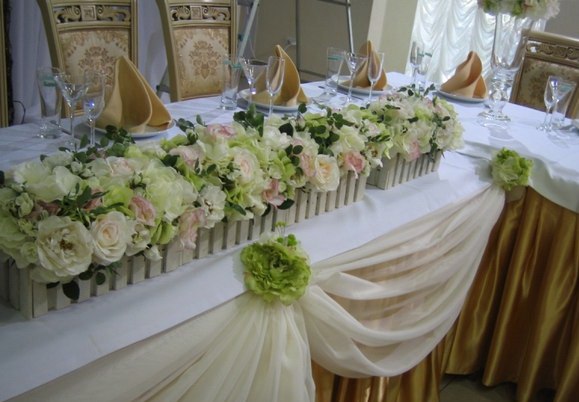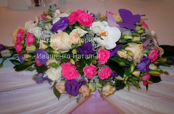 Украшение президиума цветами. Яркие композиции на стол молодым, декор и аксессуары. Разных стилей композиции на стол молодых. Широкий выбор цветов, декра, цена от 600грн. |