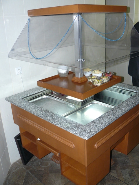 Имеет квадратную форму, изготовлен из нержавеющей стали и предназначен для выкладки закусок, салатов, фруктов и десертов. Витрина используется для самообслуживания и обеспечивает свободный доступ к блюдам со всех сторон. Витрина оборудована подсветкой, корпус отделан деревом и дополнен столешницей из серого гранита.