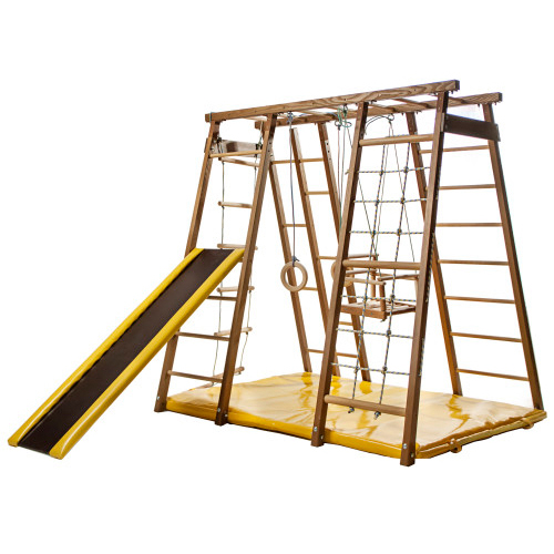 Детский спортивный развивающий уголок комбинированный металл+дерево. Высота 145см. Горка и кольца с канатом в комплекте!