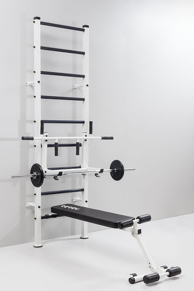 Съёмная, складываемая скамья, с 4-мя пенополиуретановыми валиками для ног и съемным сидением, может использоваться как скамья для пресса, и как лавочка для жима штанги лежа и жима штанги полусидя.