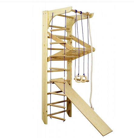 Особенность этой деревянной спортивной стенки в том, что она очень удобна для детей младшего возраста и при этом сохраняет грузоподъёмность в 120кг. Частота горизонтальных перекладин у неё больше чем у конкурентов, в связи с чем, ребёнку удобнее спускаться и взбираться. Этот же факт делает её более безопасной.