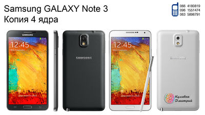 Предложение от интернет магазина Мир Смартфонов . Samsung Note III (4 ядра) копия. Все телефоны абсолютно новые в плёночках . Гарантия на все телефоны 1 год. Сервисный центр в Украине. Доступные цвета : черный, белый. Видео обзор и характеристики у нас сайте : http://world-smartphones.com.ua/smartphony-telephony/kopiya-samsung-note-3 Контактные телефоны: 066-41-80-819, 096-15-51-474, 063-58-98-791 Мы всегда рады вам помочь . |